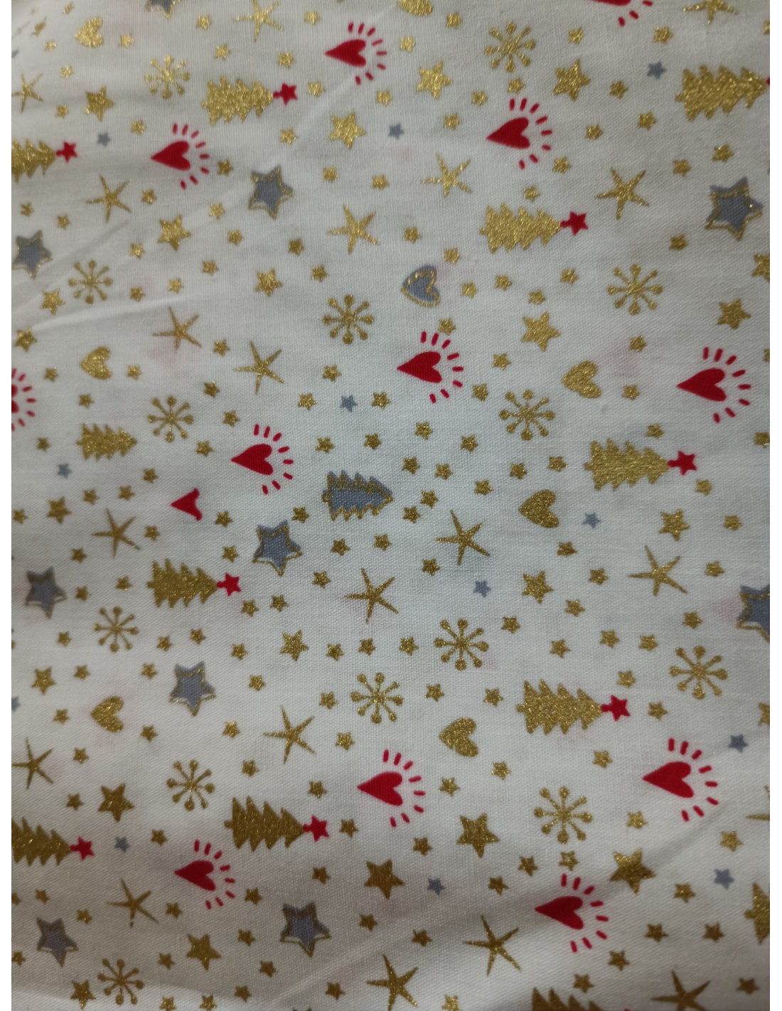 tela de algodon con pequeños motivos navideños, arbol de navidad, estrellas, etc.